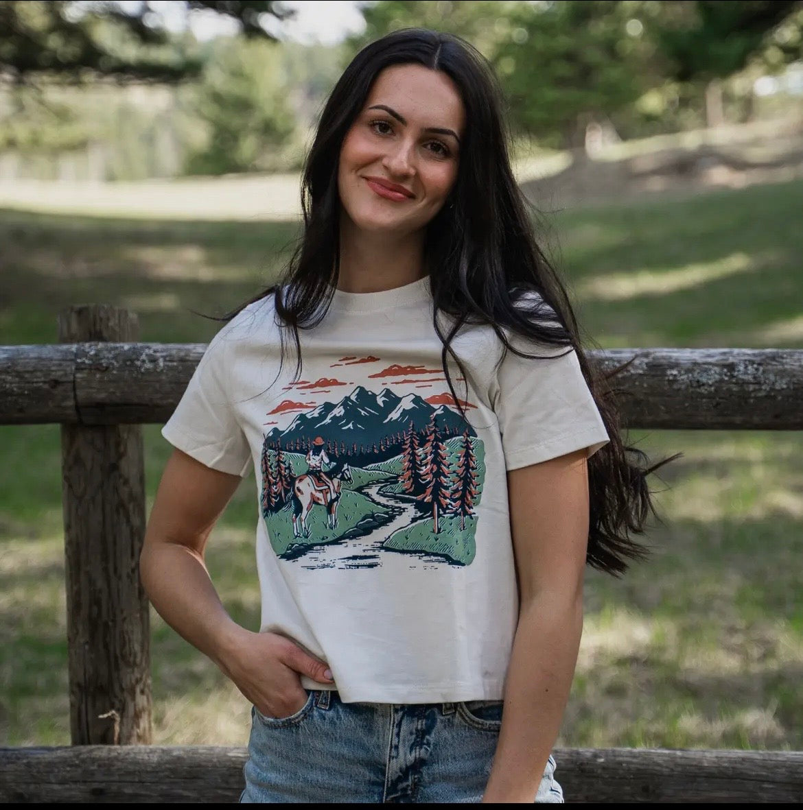 Take Me Home T-Shirt takes you to new heights in style! Featuring a classic mountain and valley landscape, this vintage white tee is 100% cotton for ultimate comfort. The cropped and boxy fit adds a trendy touch. Ready for an adventure?